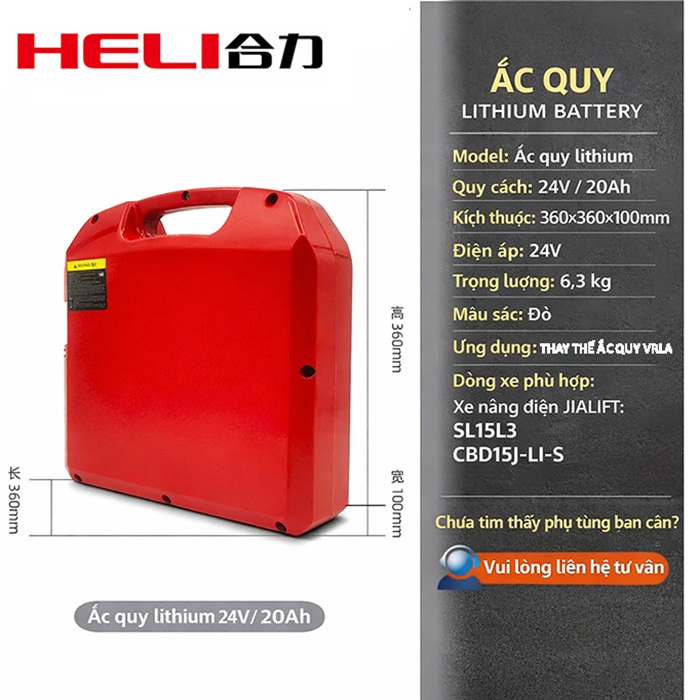 Ắc quy xe nâng 24V20Ah dùng để thay thế pin acid chì VRLA, phù hợp với các mẫu xe nâng SL15L3 JIALIFT và CBD15J-LI-S Heli. Với mức dung lượng tiêu chuẩn, sản phẩm giúp xe hoạt động ổn định, đáp ứng tốt nhu cầu làm việc cơ bản trong kho bãi và nhà xưởng.