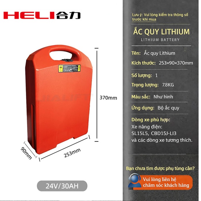 Sản phẩm dùng để thay thế pin acid chì VRLA, phù hợp với các mẫu xe nâng SL15L5 của JIALIFT, CBD15J-LI3 của Heli. Dòng ắc quy Lithium xe nâng 24V30Ah này cho thời gian hoạt động dài hơn, giúp xe vận hành ổn định và nâng cao hiệu suất sử dụng. Đây cũng là lựa chọn phù hợp cho khách hàng đang tìm ắc quy xe nâng điện 24V30Ah chất lượng, độ tương thích cao.