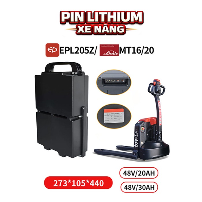 Ắc quy xe nâng điện EPL205Z là dòng pin Lithium hiện đại, được thiết kế với 2 phiên bản dung lượng 48V20Ah và 48V30Ah, giúp kéo dài thời gian sử dụng và đáp ứng tốt nhu cầu vận hành liên tục. Sản phẩm có kích thước chuẩn gồm chiều cao 440mm, chiều rộng 258mm, chiều dày 108mm, phù hợp lắp đặt cho nhiều dòng xe nâng điện thông dụng.