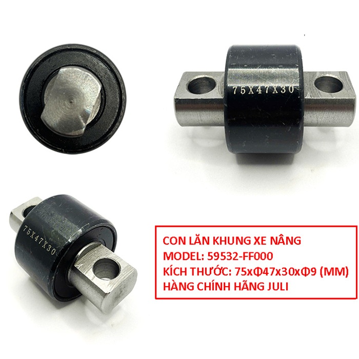 Con lăn khung 59532-FF000. Kích thước: 75xØ47x30xØ9 (mm). Dùng trên xe nâng Nissan 2-3.5 tấn.