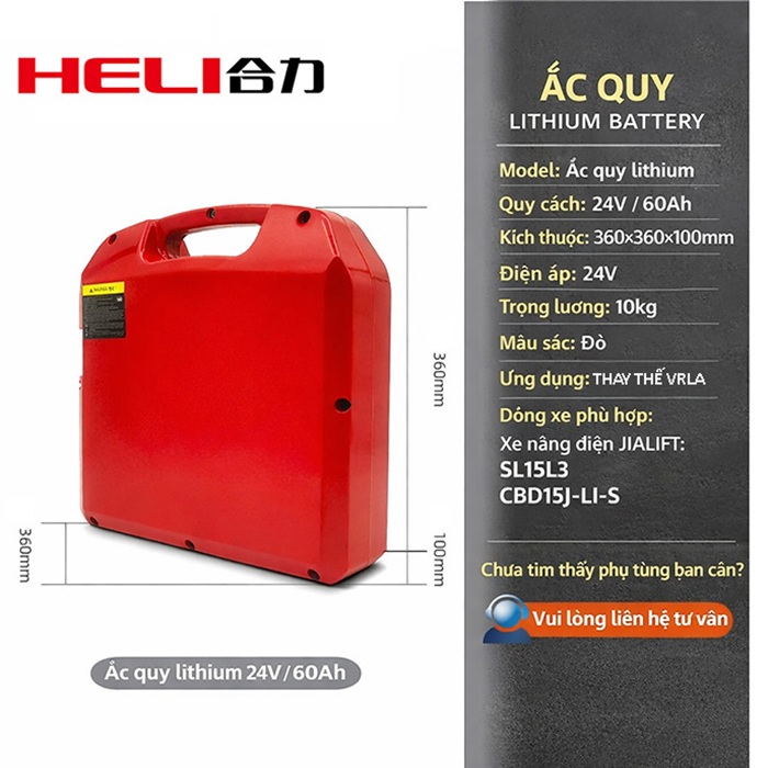 Ắc quy xe nâng 24V60Ah phù hợp để thay thế pin acid chì VRLA, tương thích với các mẫu xe nâng SL15L3 của JIALIFT và CBD15J-LI-S của Heli. Dòng pin dung lượng cao giúp xe nâng hoạt động lâu hơn, tăng hiệu quả công việc và giảm số lần sạc trong ngày.