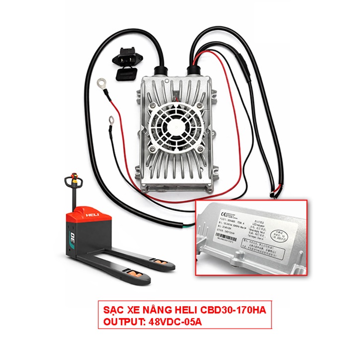 Sạc xe nâng Heli CBD30-170HA là bộ sạc trong, lắp liền thân xe, dùng để sạc cho ắc quy chì axit kín khí, không cần bảo dưỡng (VRLA) trên dòng xe nâng điện Heli CBD30-170HA.