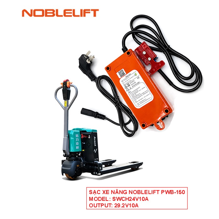 Sạc xe nâng Noblelift PWB-150 (model SWCH24V10A) là bộ sạc nhanh chuyên dụng cho các dòng xe nâng tay điện sử dụng pin Lithium 24V. Thiết bị phù hợp với các bộ pin dung lượng 24V20Ah, 24V30Ah và các dung lượng tương đương, giúp sạc nhanh, ổn định và an toàn cho hệ thống pin.