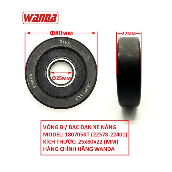 Vòng bi càng 180705KT. Mã phụ tùng 22578-22401, Hàng chính hãng Wanda, lắp trên xe nâng dầu 2 tấn, 2.5 tấn, 3 tấn HELI (H3 series, H2000 series, K2 series).