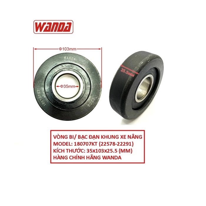Bạc đạn 180707K. Mã phụ tùng: 22578-22291 lắp phổ thông trên các mẫu xe nâng 4 tấn – 4.5 tấn – 5 tấn HELI (K2 series, H series, H3 series). Có nhiệm vụ dẫn hướng giá nâng di chuyển lên theo phương thẳng đứng. Tiếp xúc thường xuyên với khung nâng, chịu lực tác động trực tiếp từ giá nâng mỗi khi tải hàng.