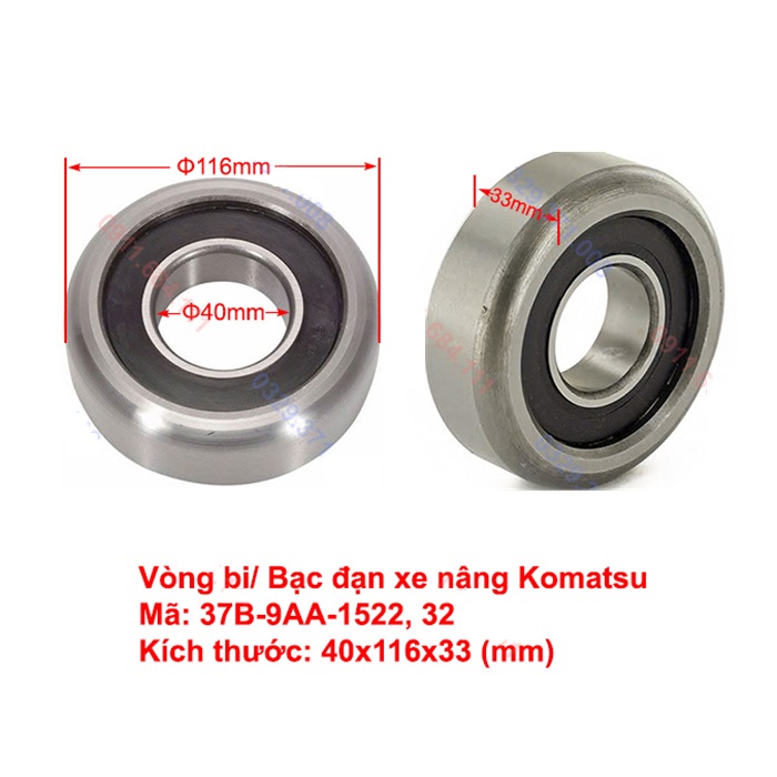 Bạc đạn khung nâng 37B-9AA-1522, 37B-9AA-1532. Kích thước: 40*116*33 (mm). Sử dụng trên các dòng xe nâng dầu Komatsu 2 tấn, 2.5 tấn (FD20-25-14 S/N 550001-UP).