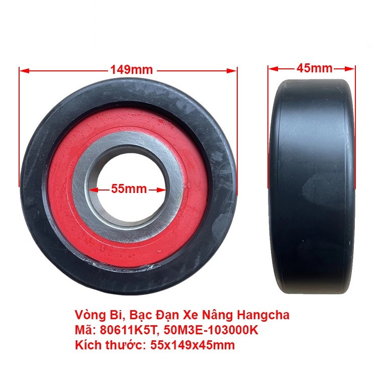 Vòng Bi 80611K5T, 50M3E-103000K, MG55A1-2T có kích thước 55x149x45mm là bạc đạn khung càng xe nâng Hangcha 5-7 tấn. CPCD50/60/70