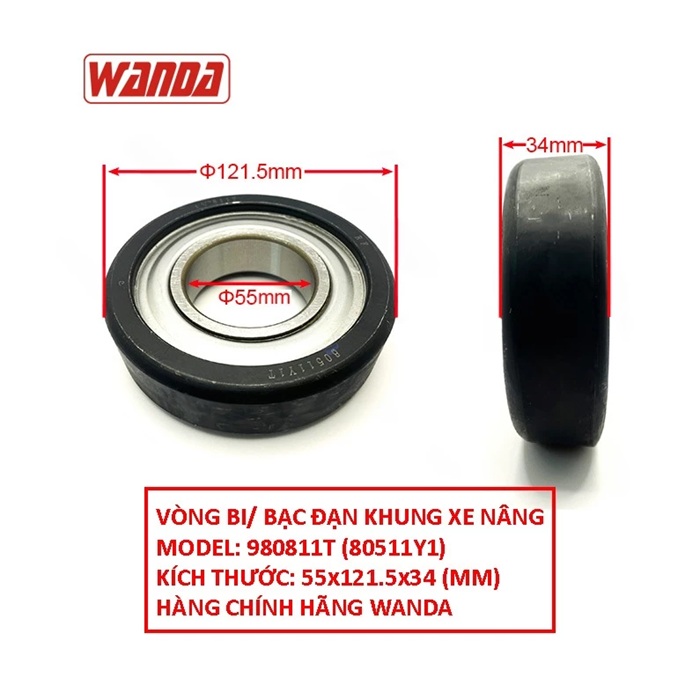 Vòng bi dẫn hướng 980811 (80511Y1) để dẫn hướng phần cột khung lồng trong xe nâng hàng. Ngoài vòng bi dẫn hướng khung nâng, xe nâng thường sử dụng vòng bi vận chuyển, con lăn đẩy bên và vòng bi lăn xích.