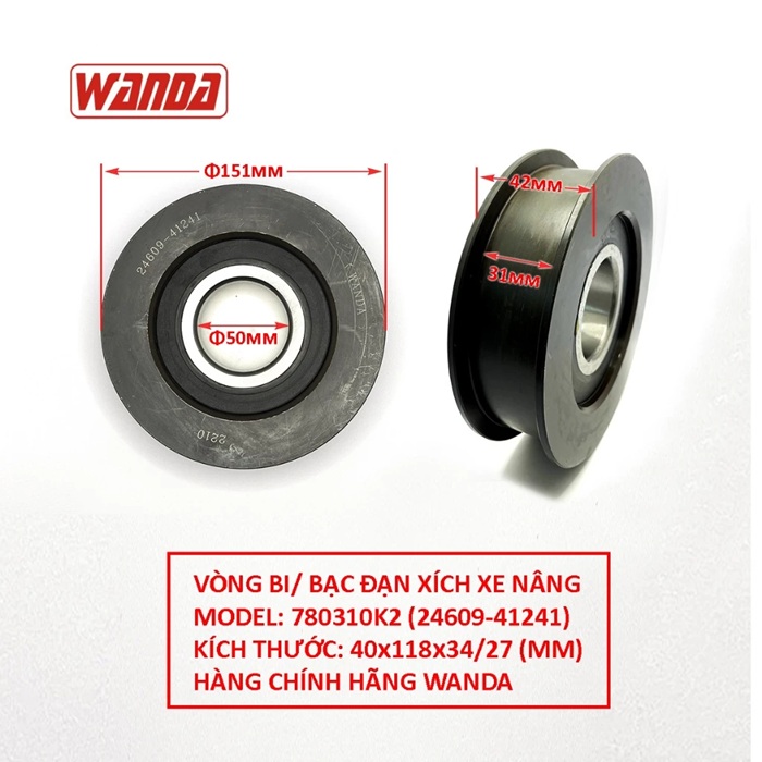 Bạc đạn xích 780310K2 (24609-41241/ 24609-41242) Hàng chính hãng Wanda được sử dụng đặc biệt trên mẫu xe nâng tải trọng 3.5 tấn của HELI (H3, H2000 series). Kích thước lón hơn các mẫu bạc đạn của xe nâng 2-3.5 tấn.